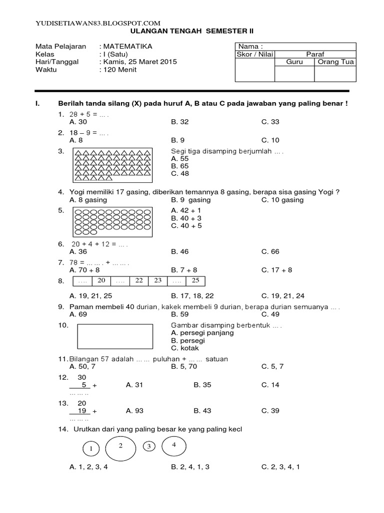 Contoh Soal Matematika Kelas 1 Sd Semester 1 2019