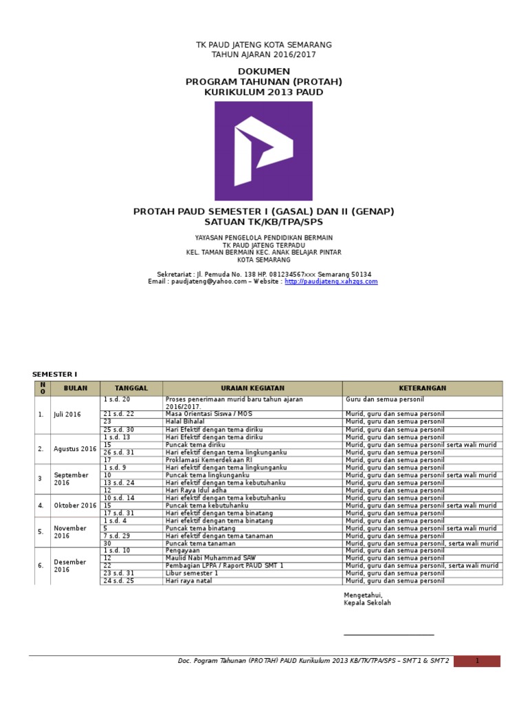 Protah Paud Kurikulum 2013 Tk Kb Tpa Smt 1 2 Paud Jateng