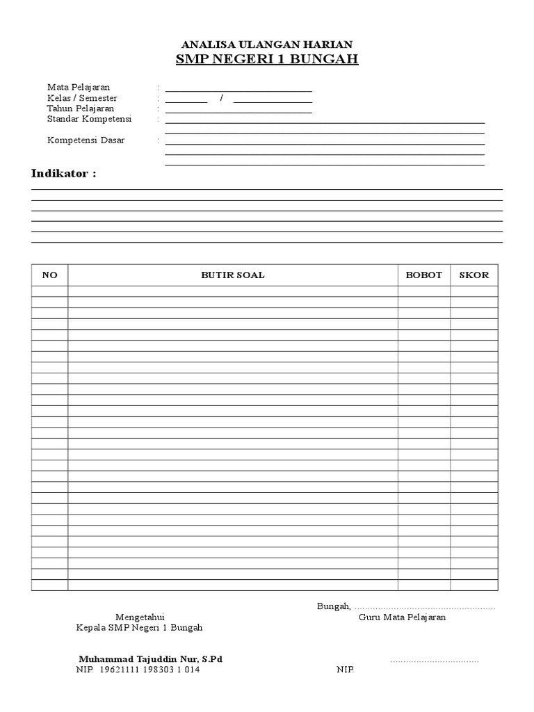 Contoh Format Analisis Ulangan Harian Kurikulum 2013 Tahun