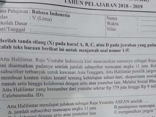 Nama Atta Halilintar Jadi Soal Ujian Kenaikan Kelas Sd Di