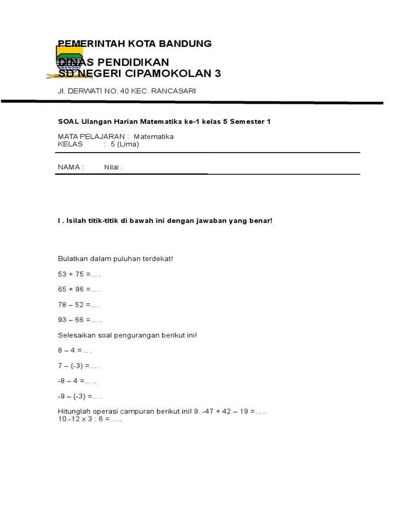 Soal Ulangan Harian Ke 1 Matematika Kelas 5 Semester 1 Doc