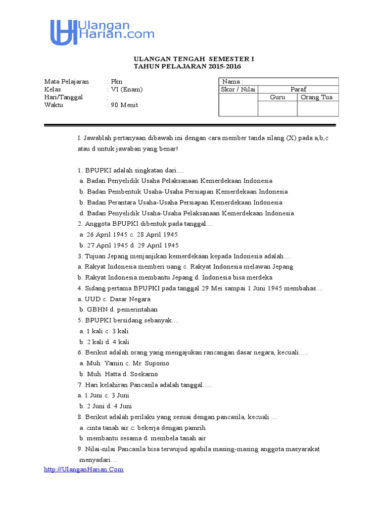 Soal Uts Pkn Kelas 6 Semester 1 Terbaru Tahun Ajaran 2018
