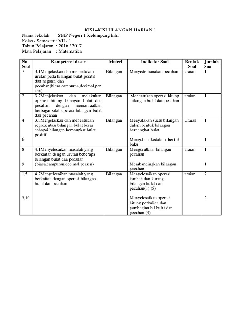 Contoh Soal Ulangan Harian Matematika Kelas Vii Pecahan