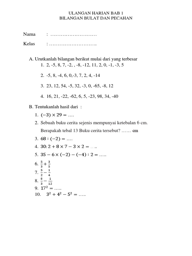 Soal Ulangan Bilangan Bulat Dan Pecahan