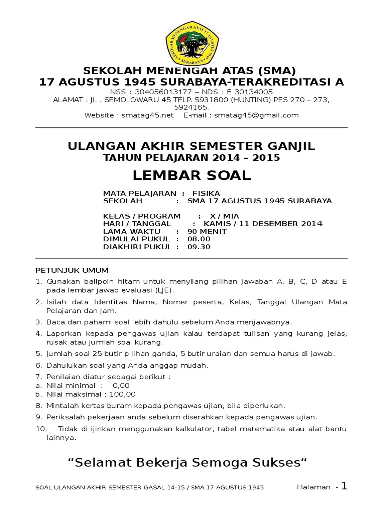 Soal Uas Fisika Kelas 10 11 12 Semester 1 Kurikulum 2013