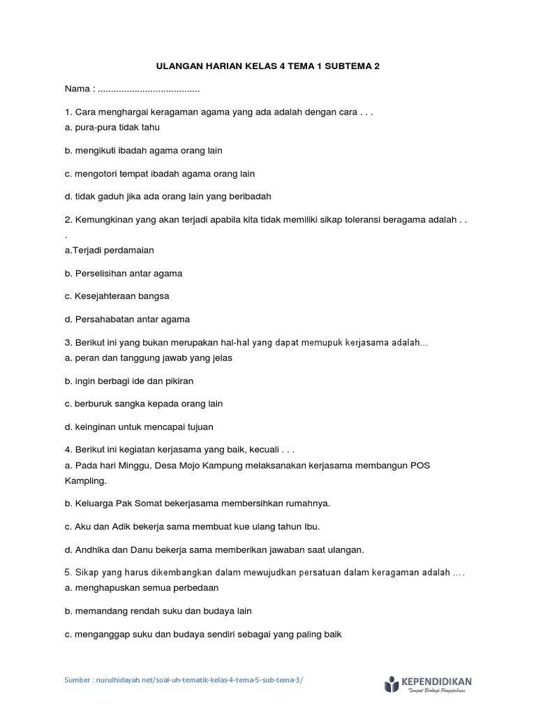 Revisi Soal Tematik Kelas 4 Tema 1 Subtema 2 Kebersamaan Dalam Keberagaman