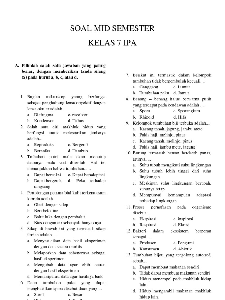 Soal Ulangan Tengah Semester Uts Ipa Smp Kelas 7 Semester