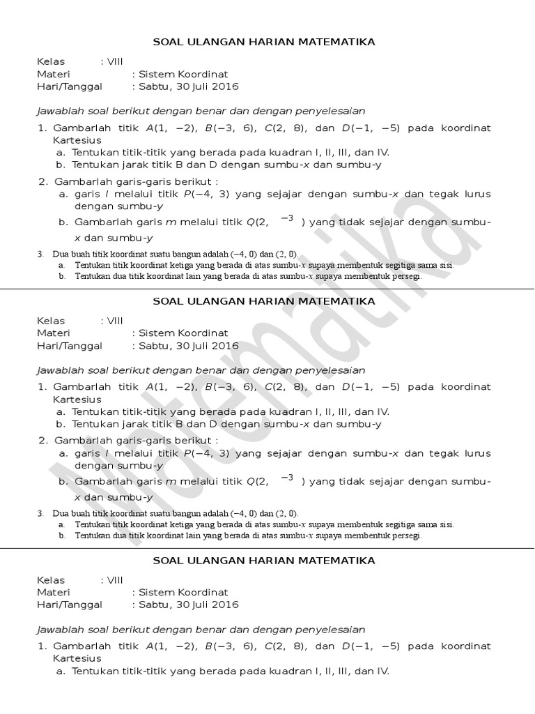 Soal Ulangan Koordinat Kartesius Kelas 8