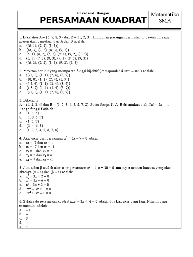 Soal Soal Persamaan Kuadrat Dan Fungsi Kuadrat