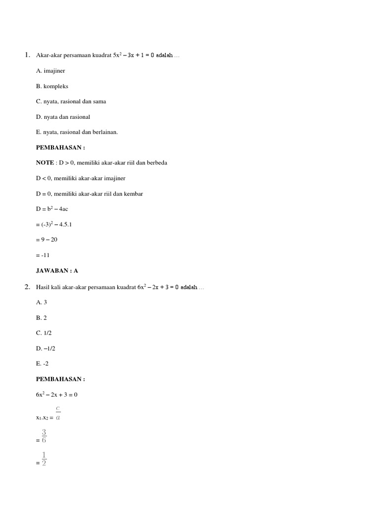 Persamaan Kuadrat Latihan Soal Pg