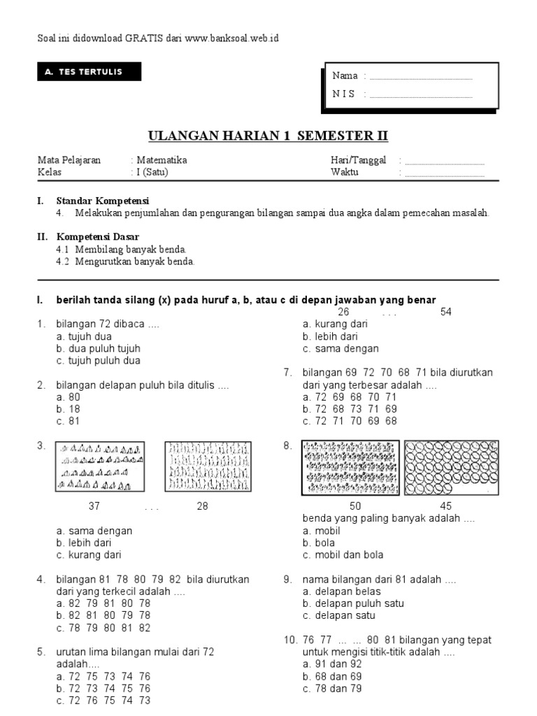 Contoh Soal Matematika Kelas 1 Sd Semester 1 2019